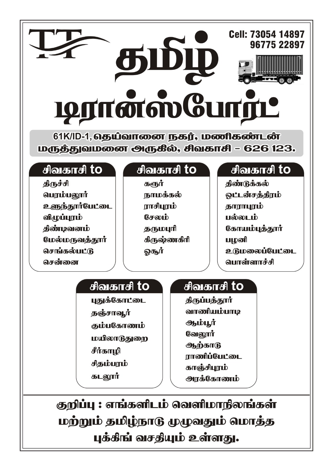 We Provide the Service through Major Roads connected with Tamilnadu, and out side other states in india.